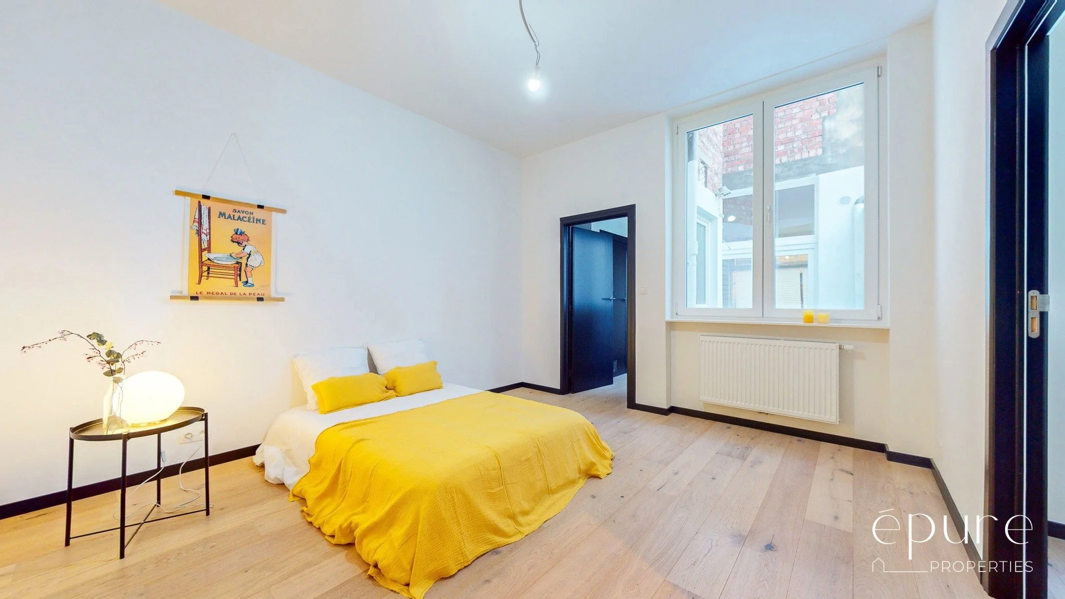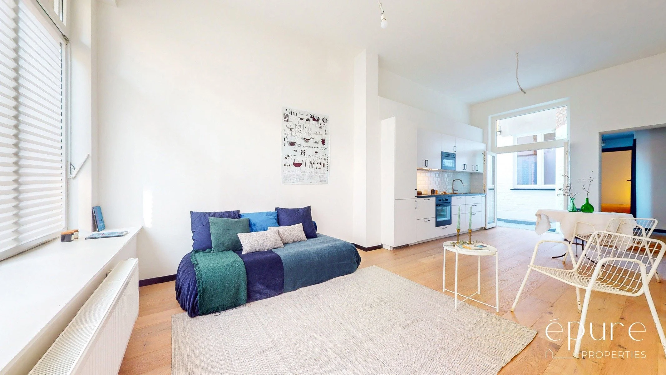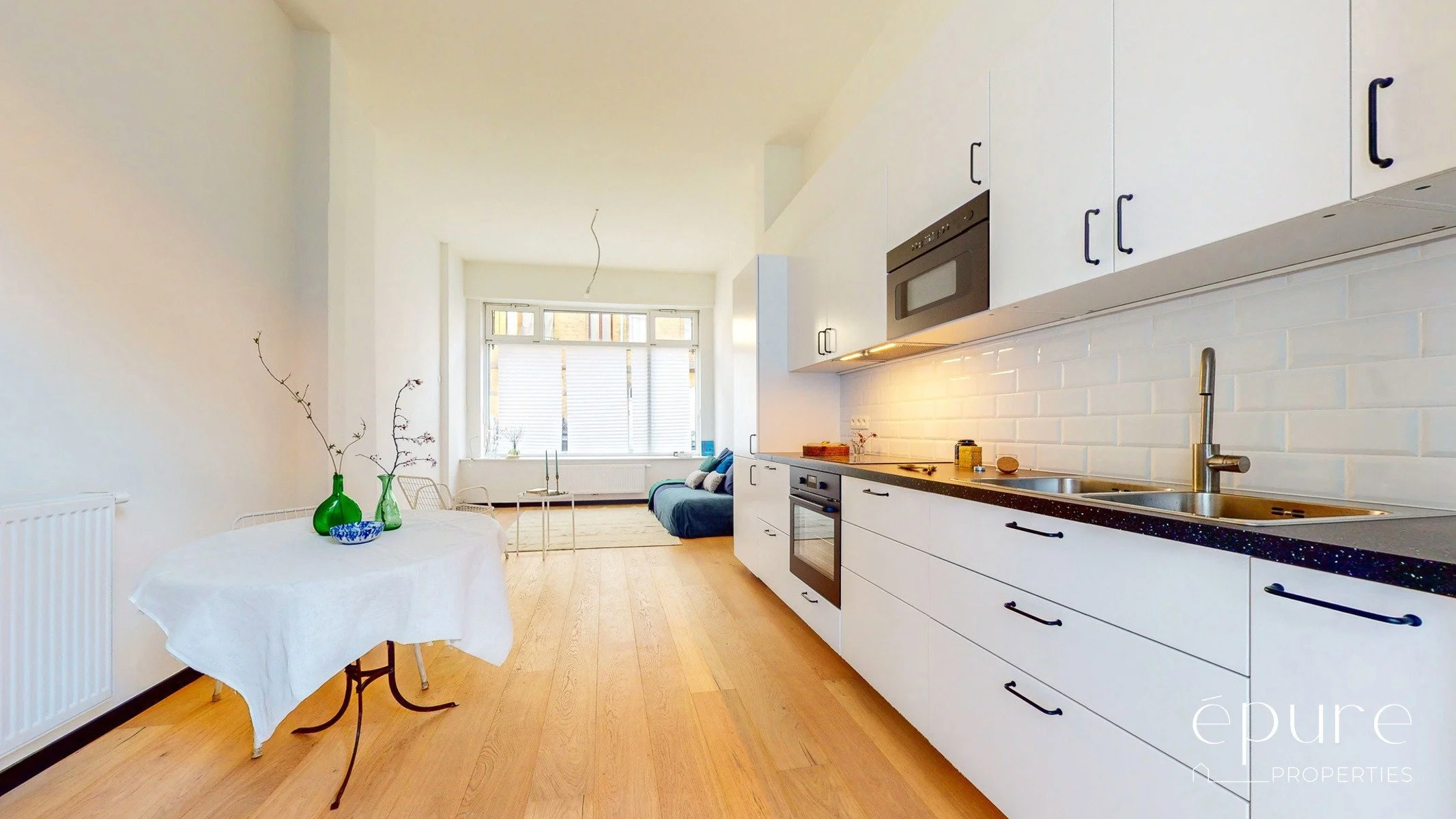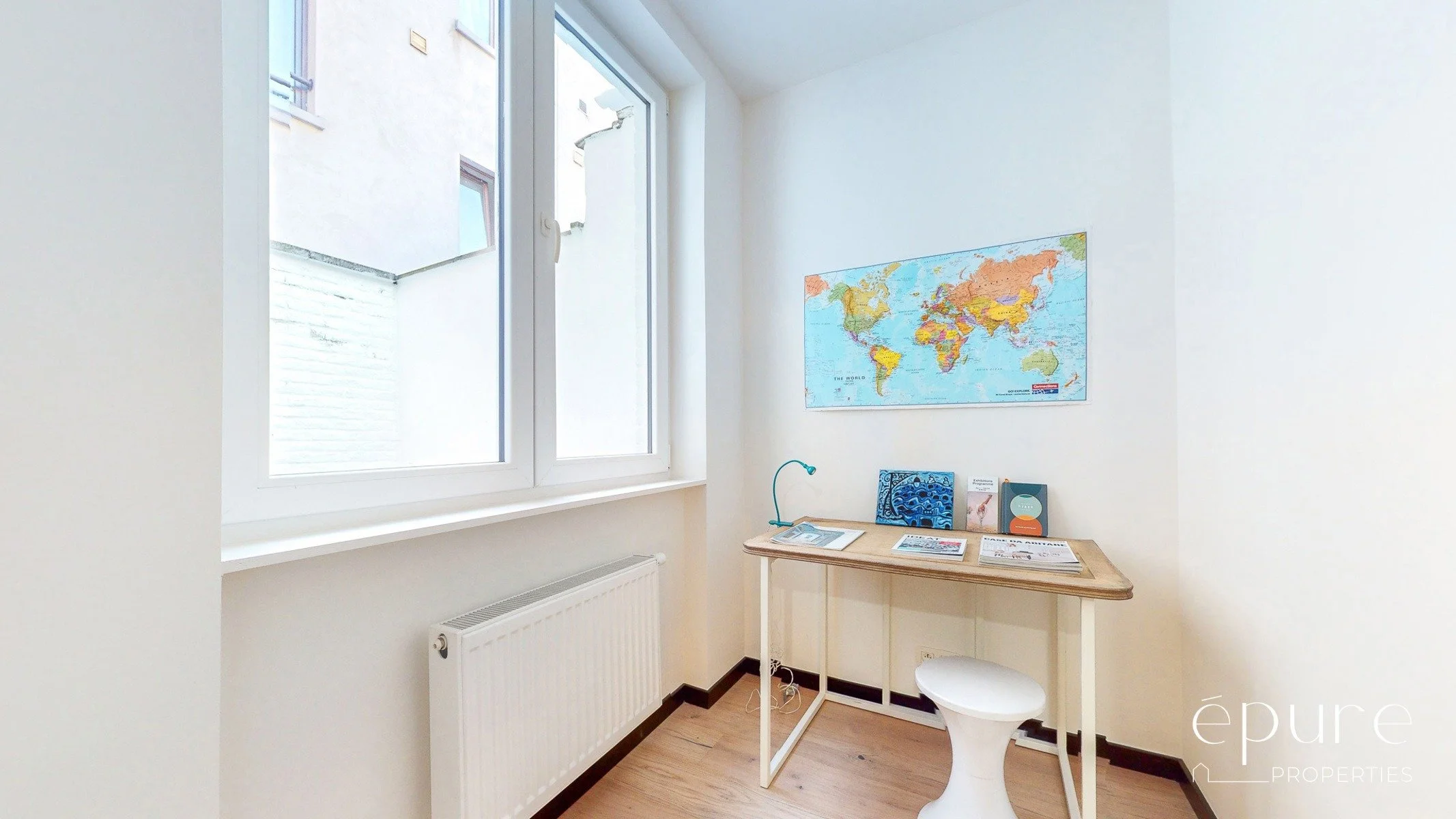 Au rez-de-chaussée d’un immeuble de 4 étages achevé en 1953, magnifique appartement une chambre + bureau entièrement remis à neuf en 2023 et mesurant 65m2 (selon PEB). Très belles hauteurs sous plafond dans le séjour (3m45) et dans la chambre (3m).