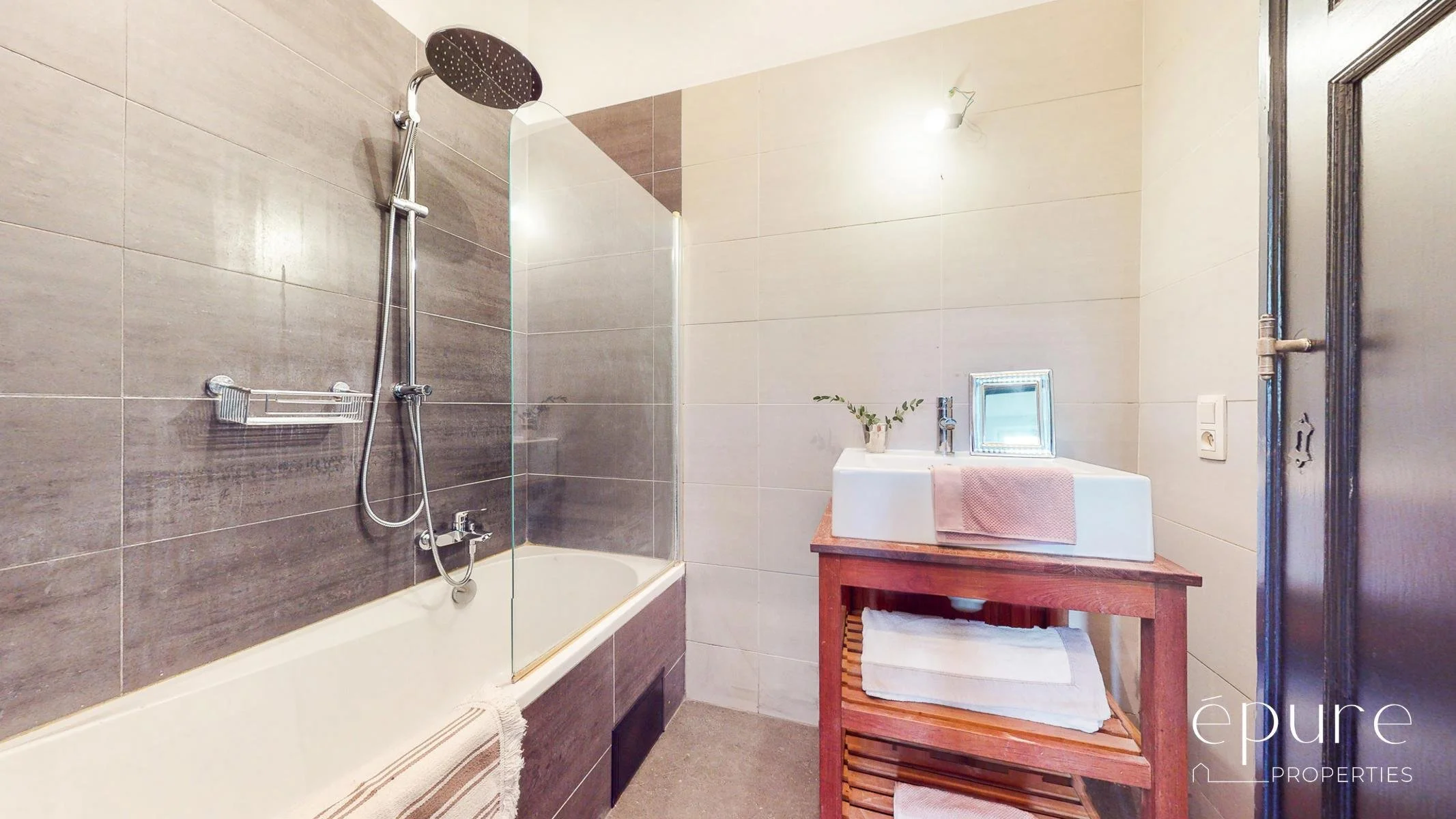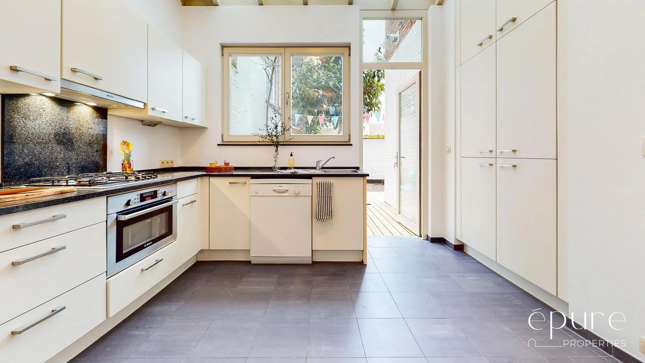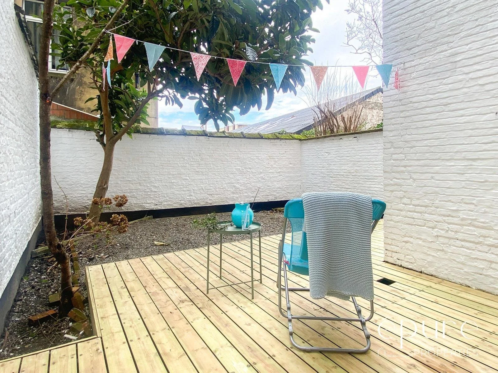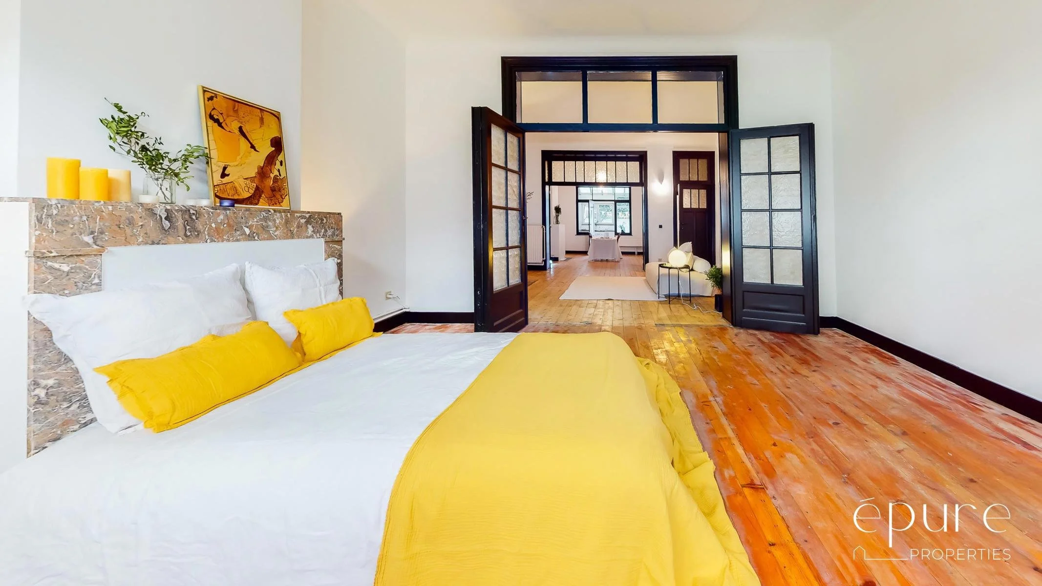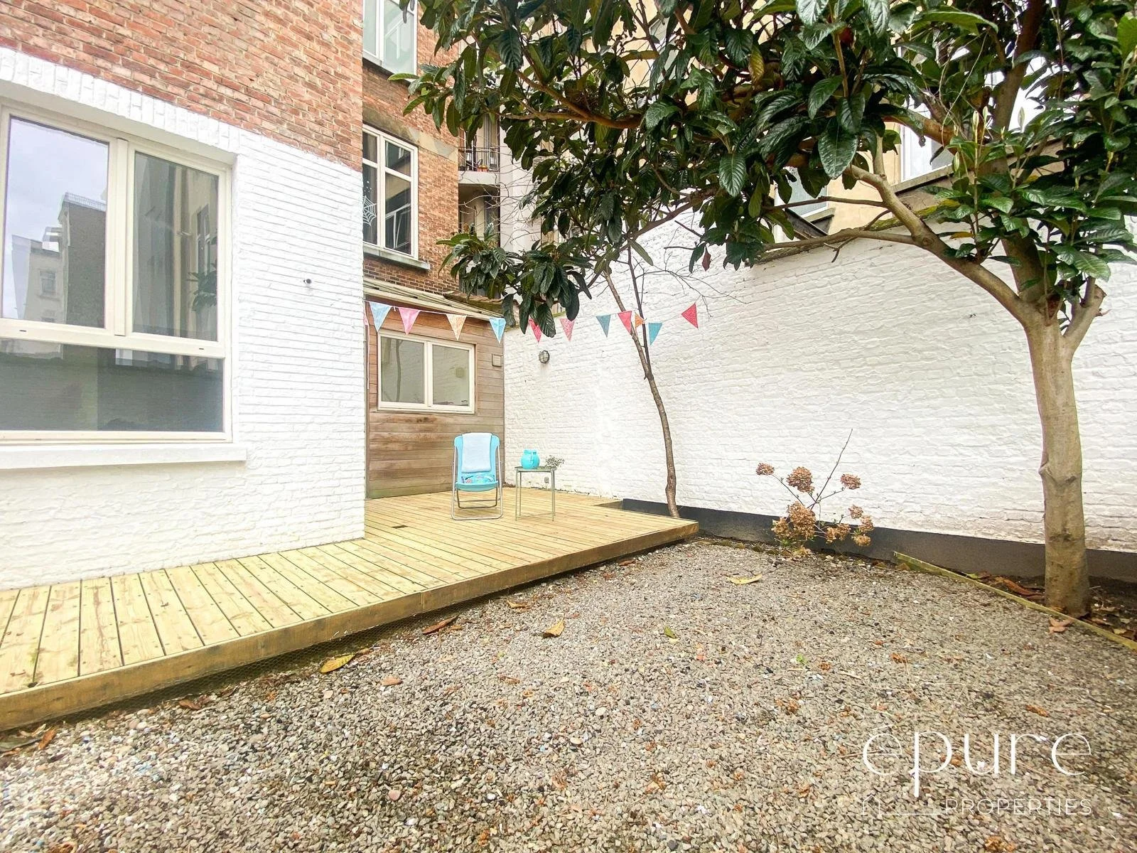 Au rez-de-chaussée d’un immeuble Art Déco datant des années 1930, magnifique appartement une chambre + bureau de 110m2 (superficie selon PEB). Une terrasse-jardin de 35m2 orientée à l’ouest complète cet appartement aux splendides volumes !
