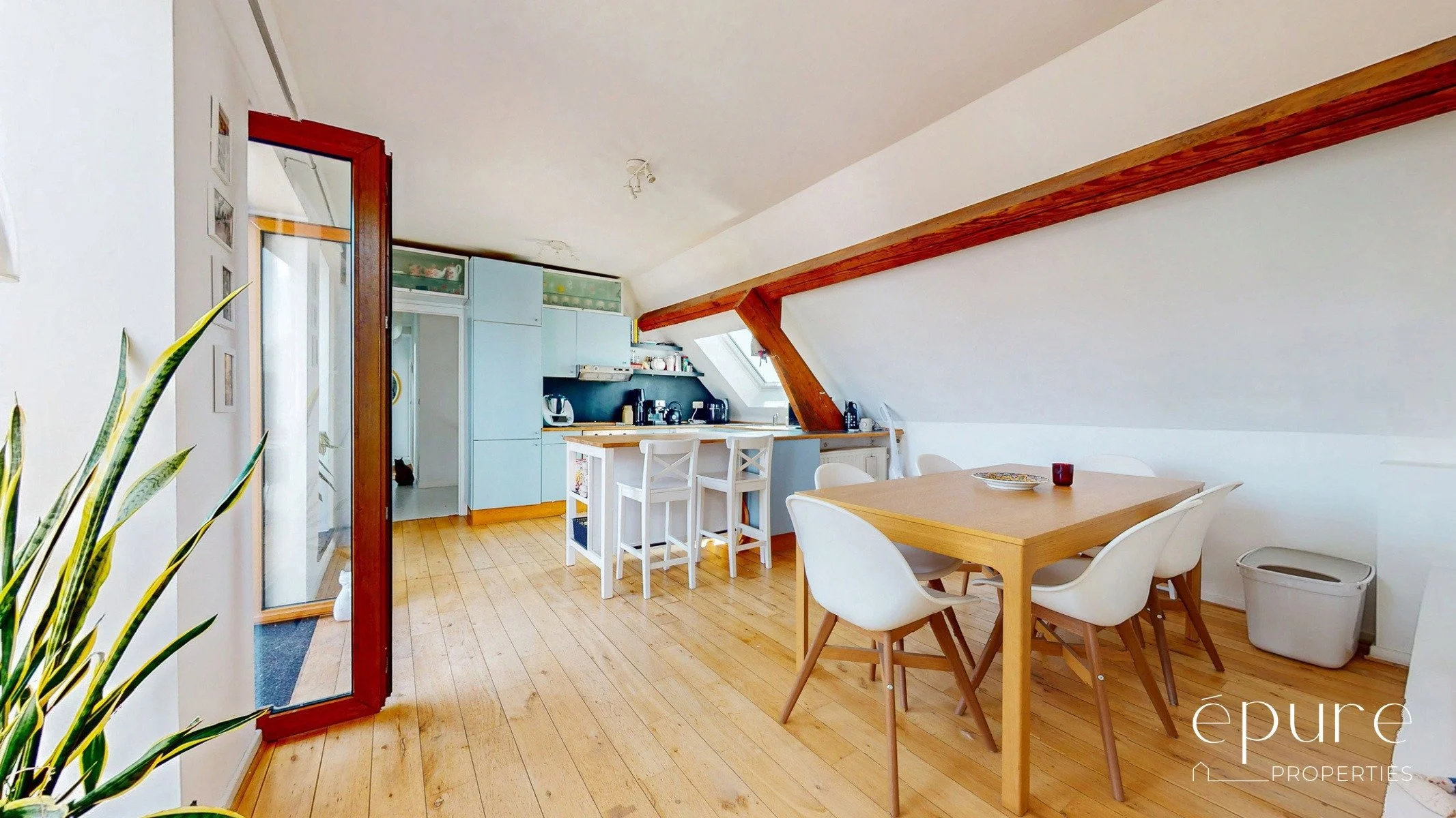 Charme débordant pour cet appartement-penthouse plein de surprises lové sous les toits et au calme, 2 très belles terrasses pour profiter de l’été (et peut-être bientôt une troisième!), un salon avec feu ouvert pour les soirées d’hiver,… coup de foudre assuré!