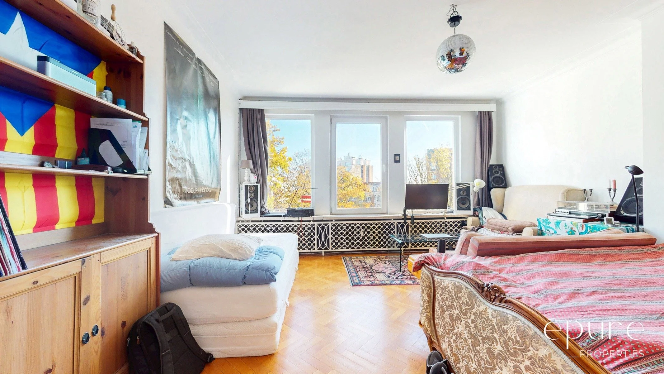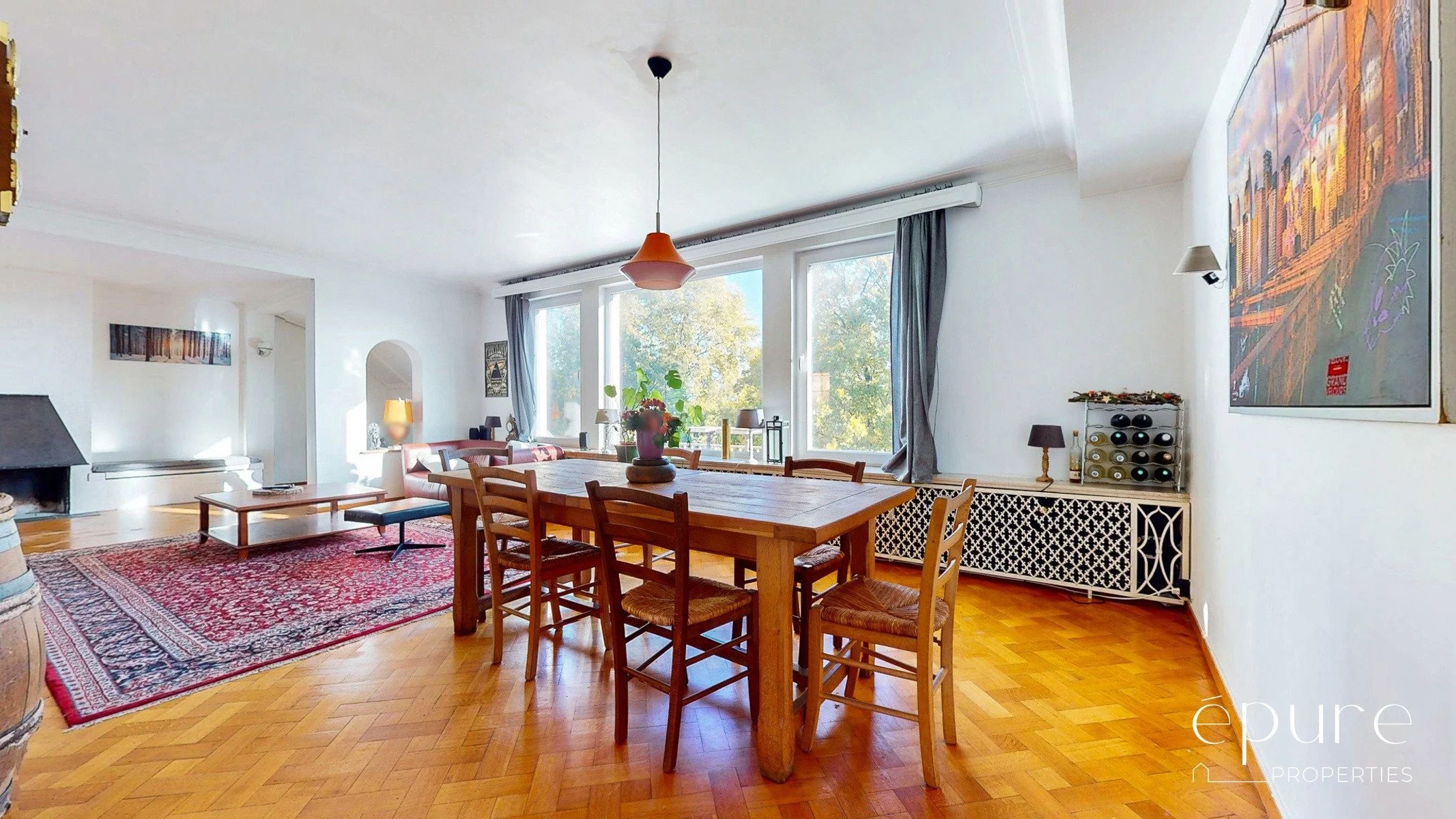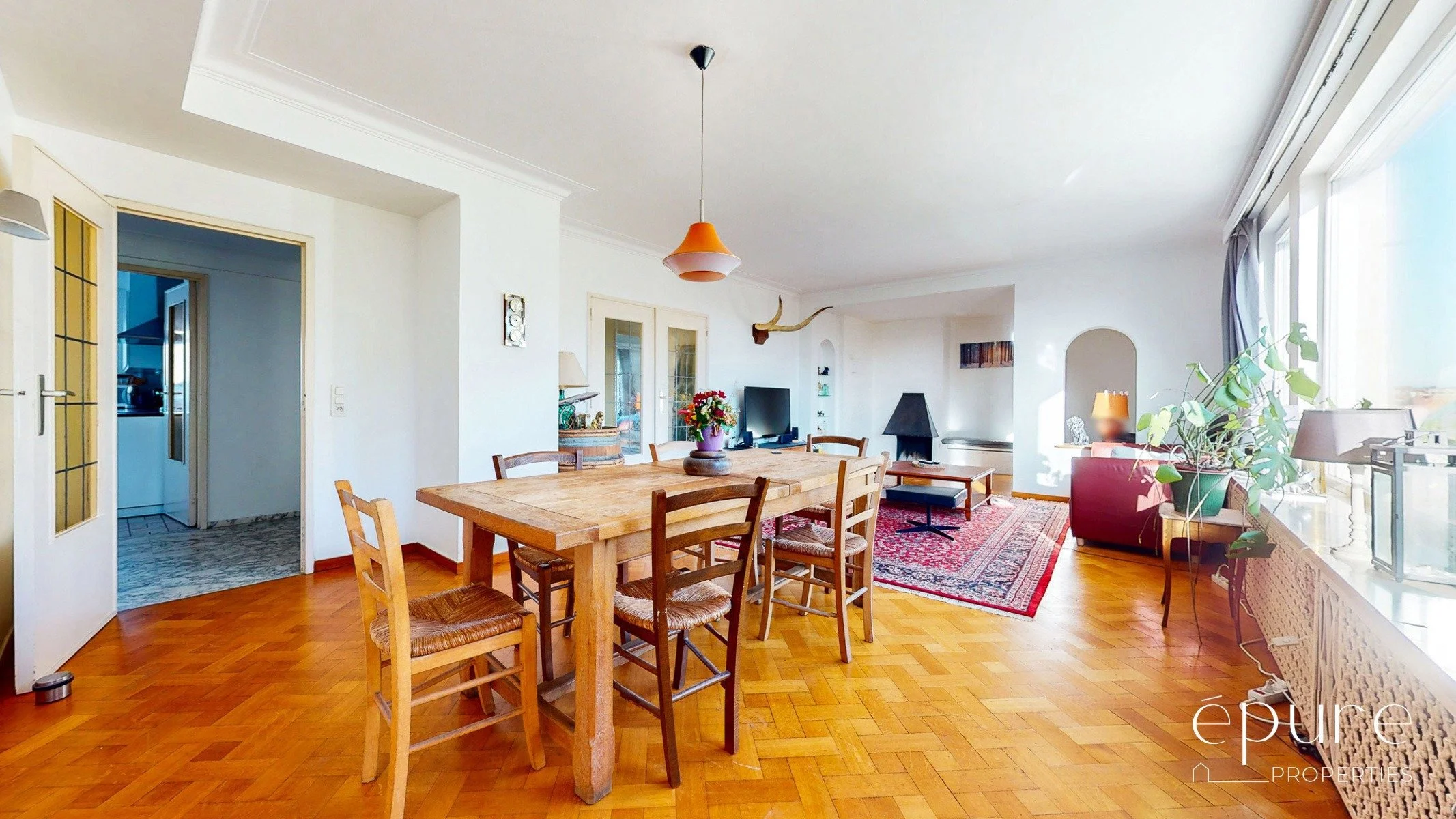 A l’avant, vaste séjour lumineux de 41m2 orienté à l’est avec parquet massif en chêne. Depuis le séjour, vue verte et dégagée sur le Square Joséphine Charlotte.