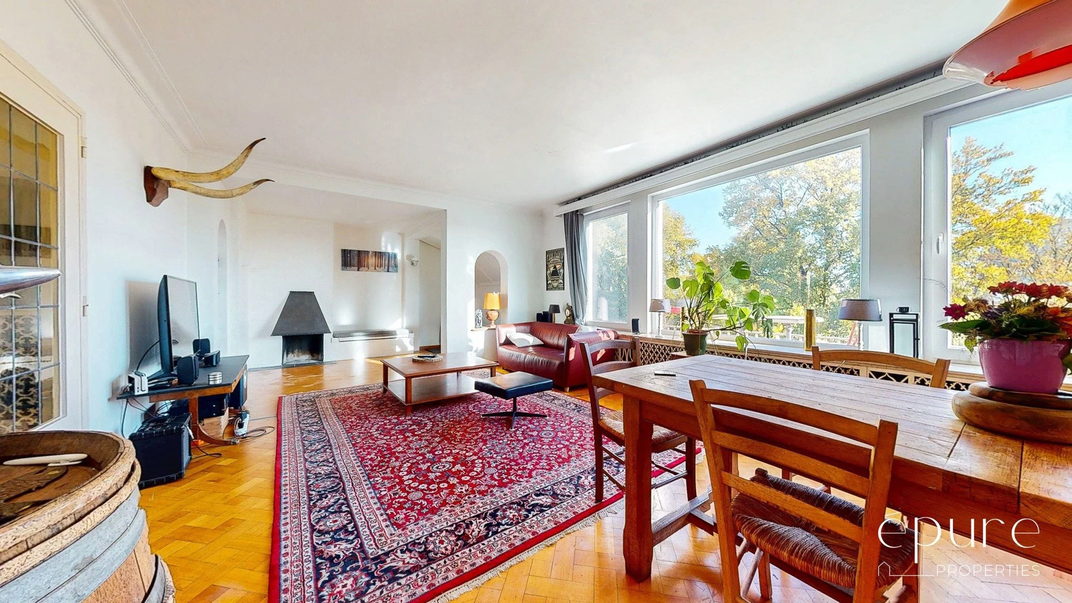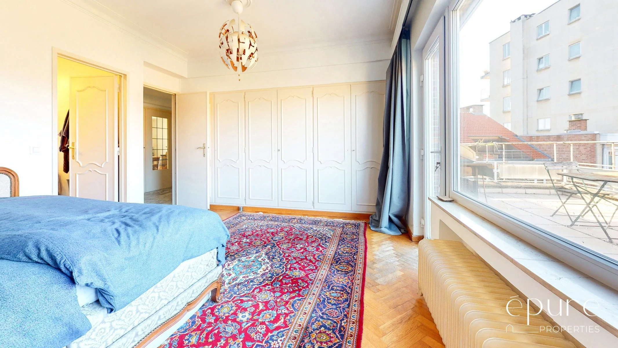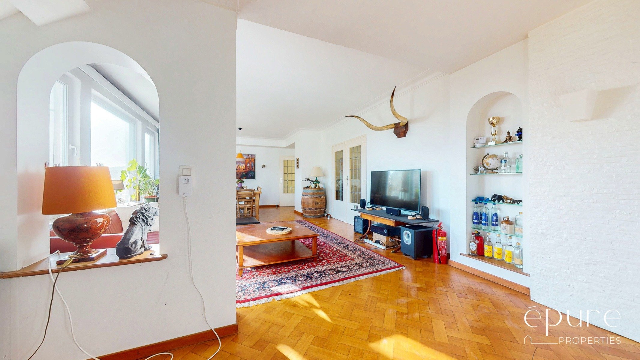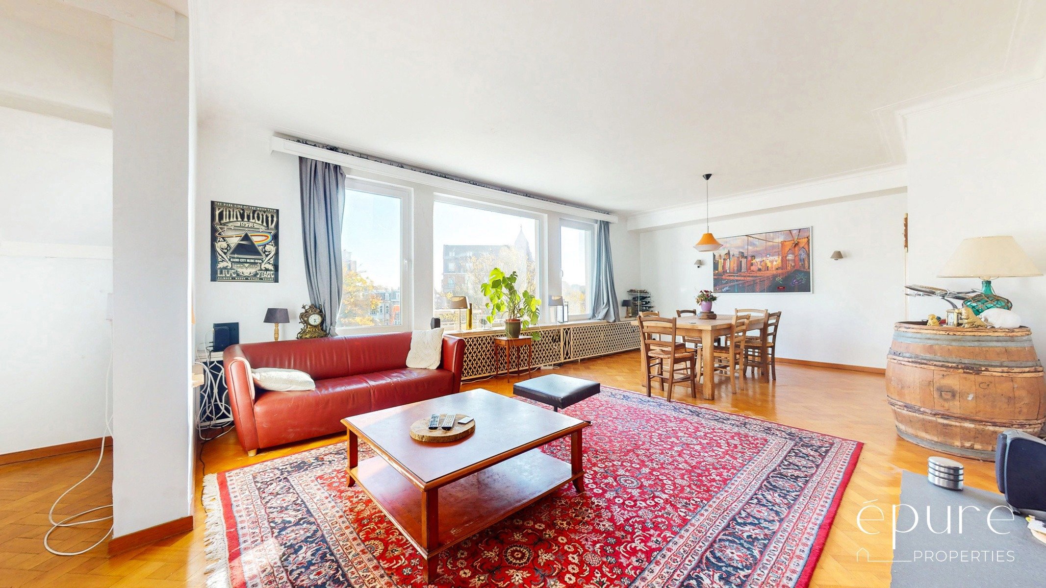 Lumineux séjour de 41m2, 2 belles chambres (20 et 17m2) et un bureau, cuisine et arrière-cuisine de 16m2, terrasse de +/-15m2 orientée à l’ouest, cave individuelle, garage fermé 1 voiture (loyer obligatoire de 150€/mois).