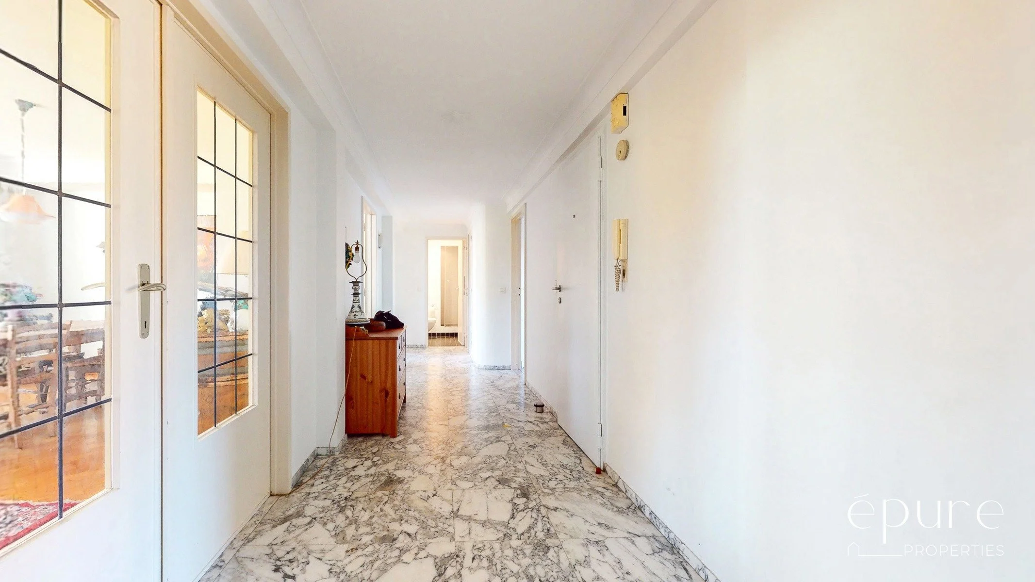 Le hall d’entrée avec placard vestiaire encastré donne accès à toutes les pièces de l’appartement.