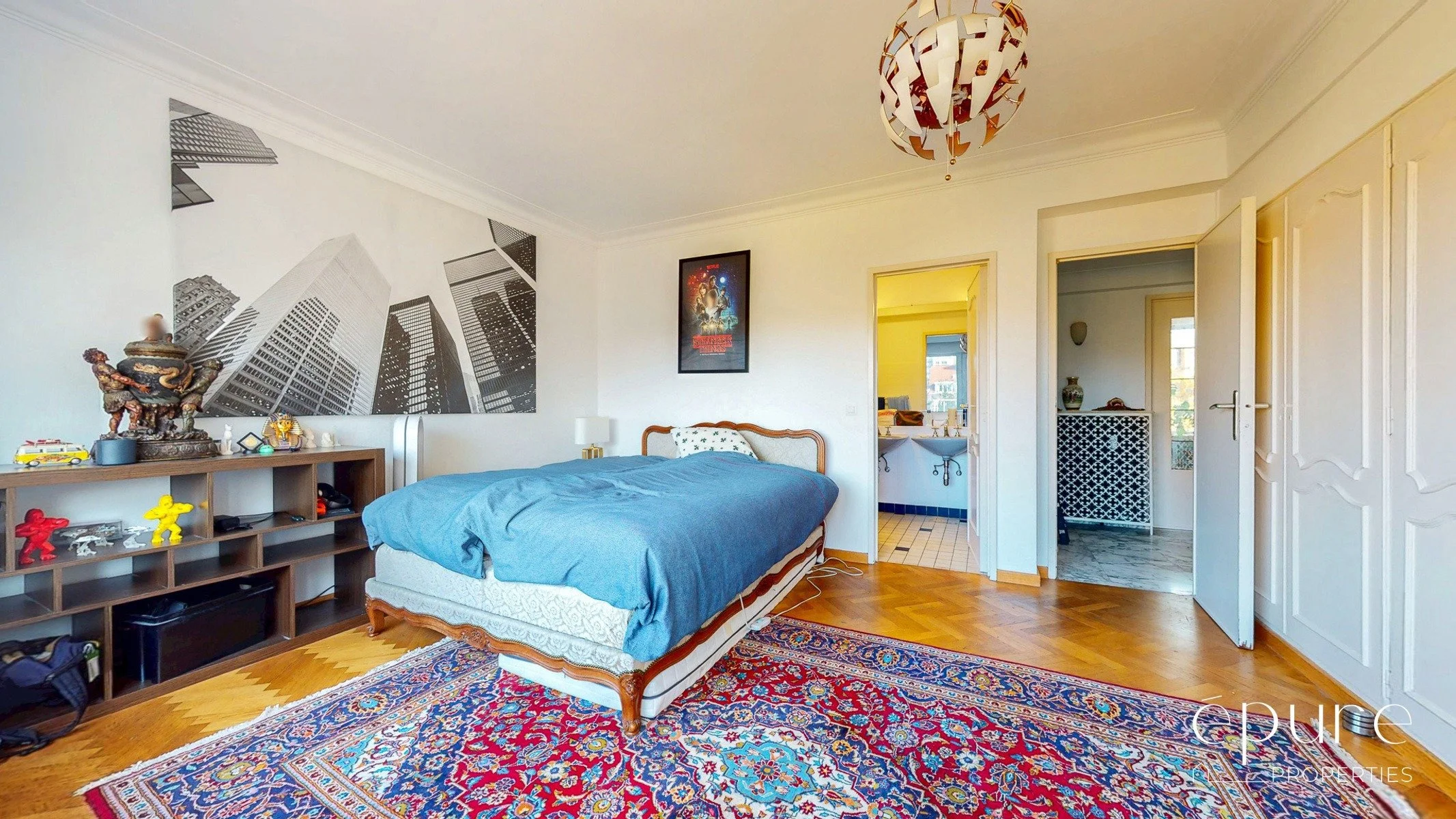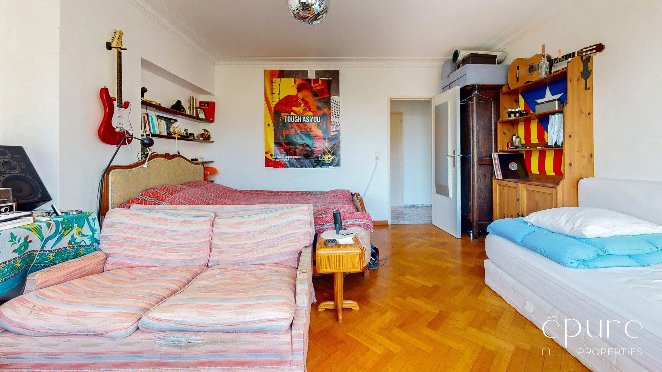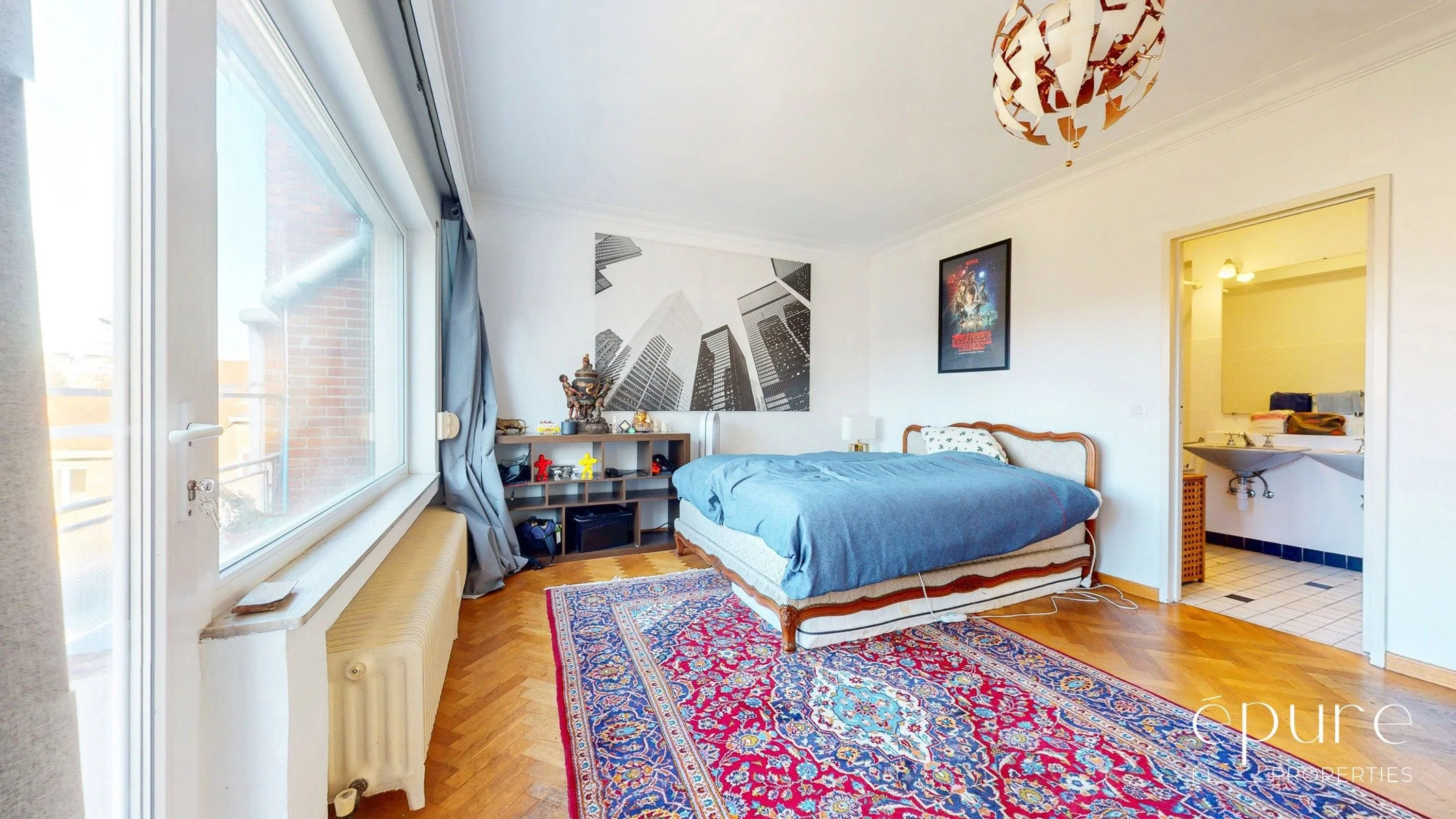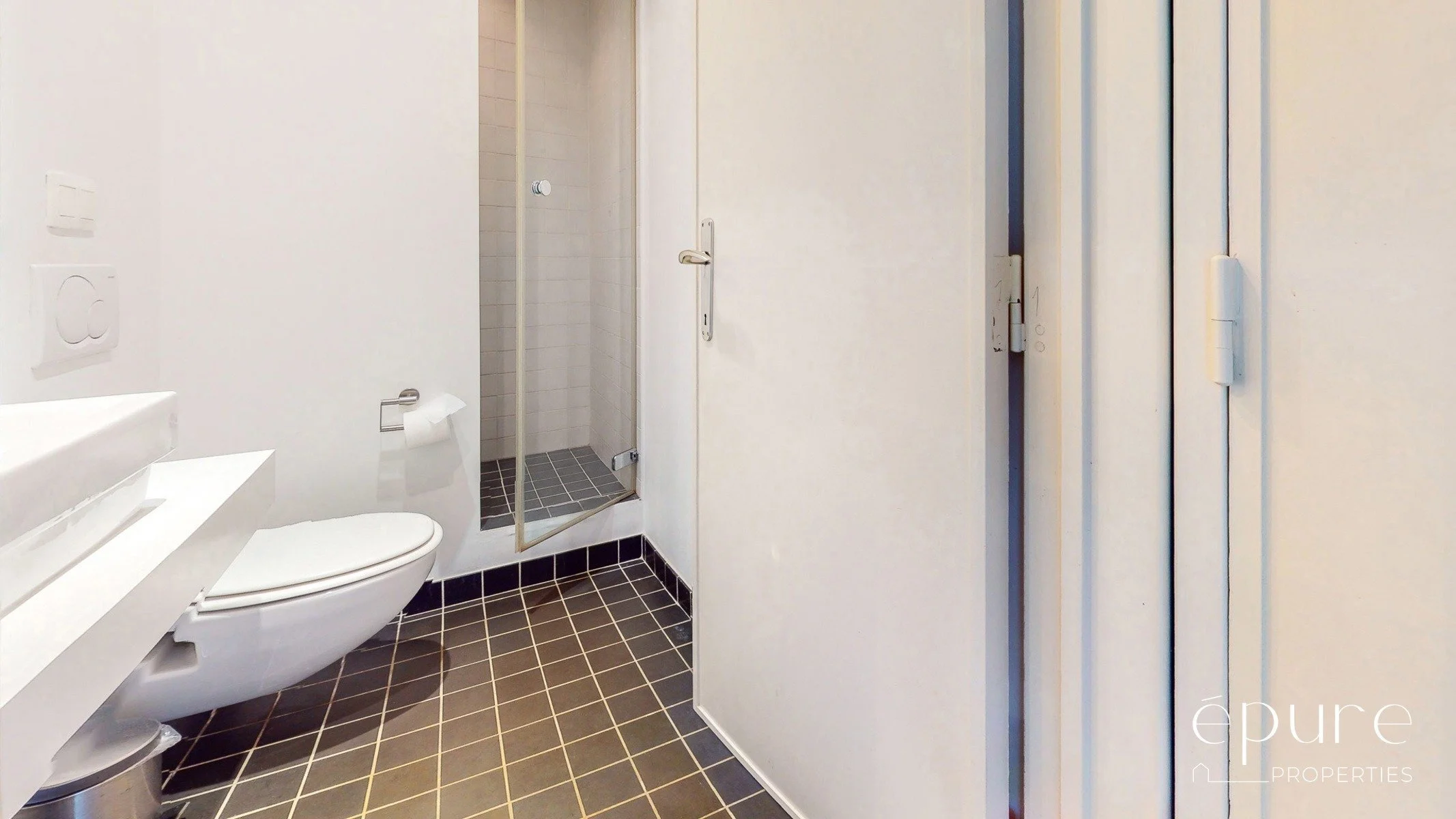 La chambre avant de 20m2 offre la même vue dégagée et verte sur le Square Joséphine Charlotte que le séjour. Elle est complétée par une petite salle de douche de 3,3m2 située juste à coté de la chambre et composée d’un lavabo, d’une petite douche et d’un WC.