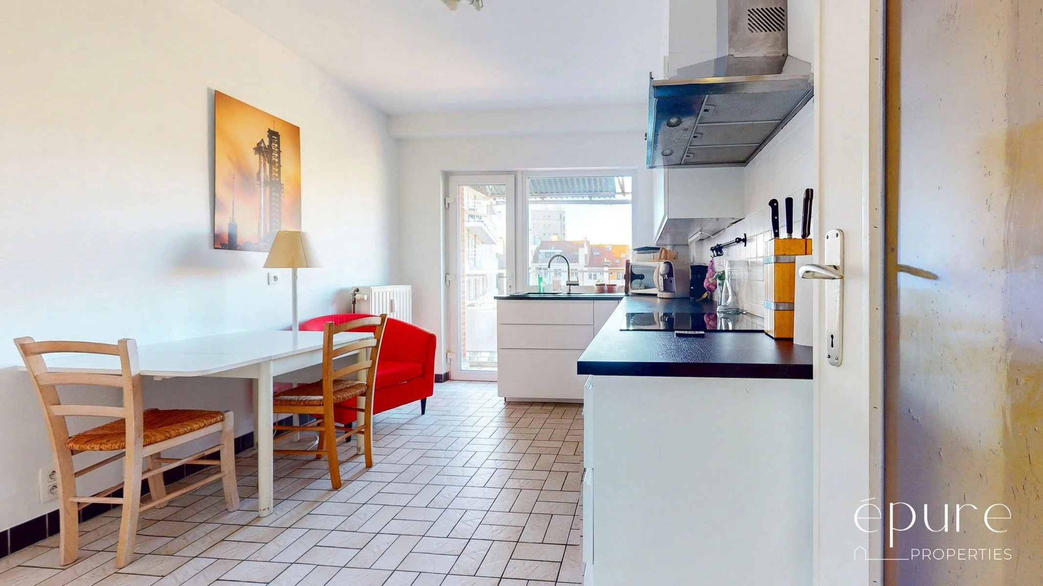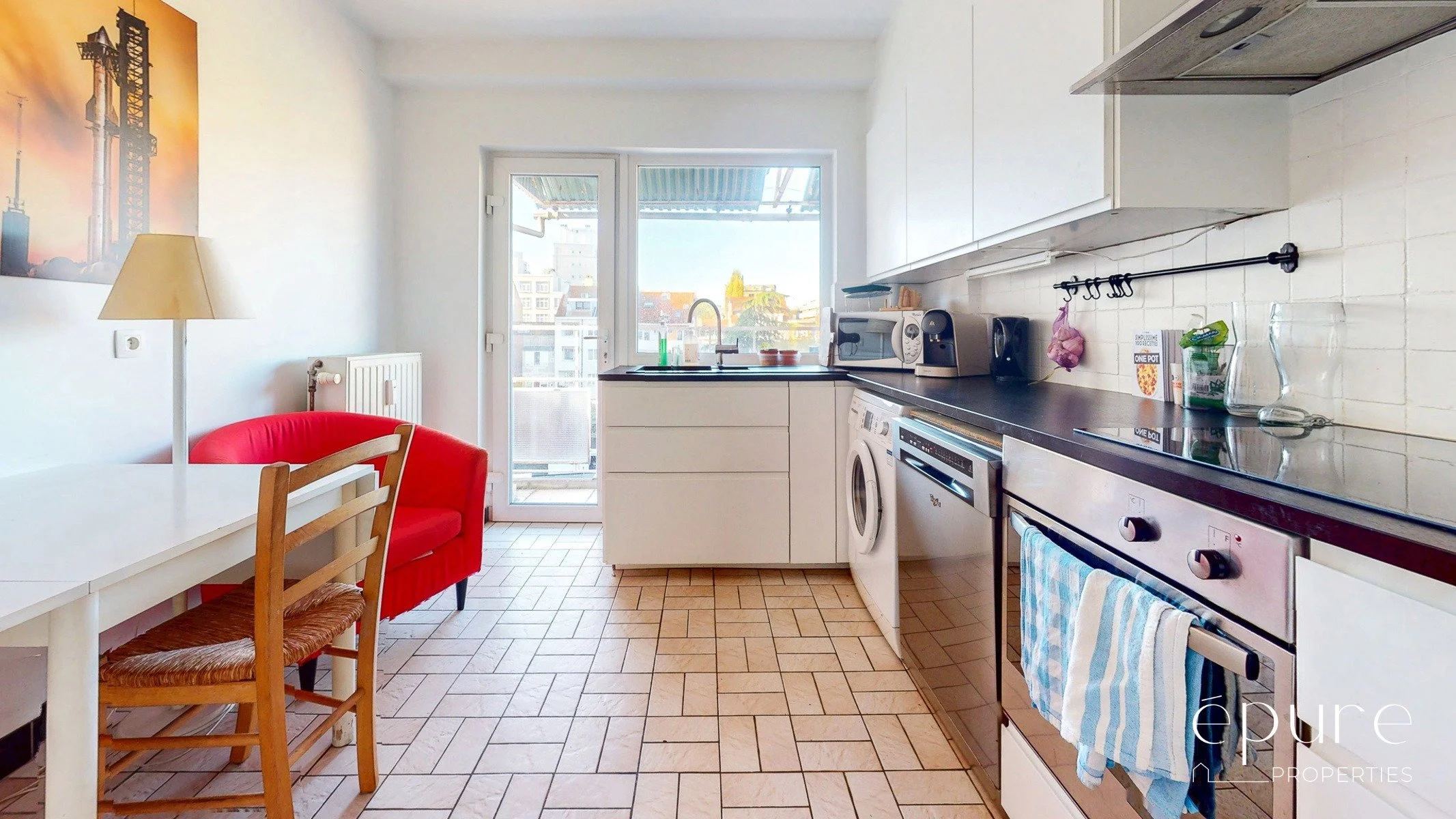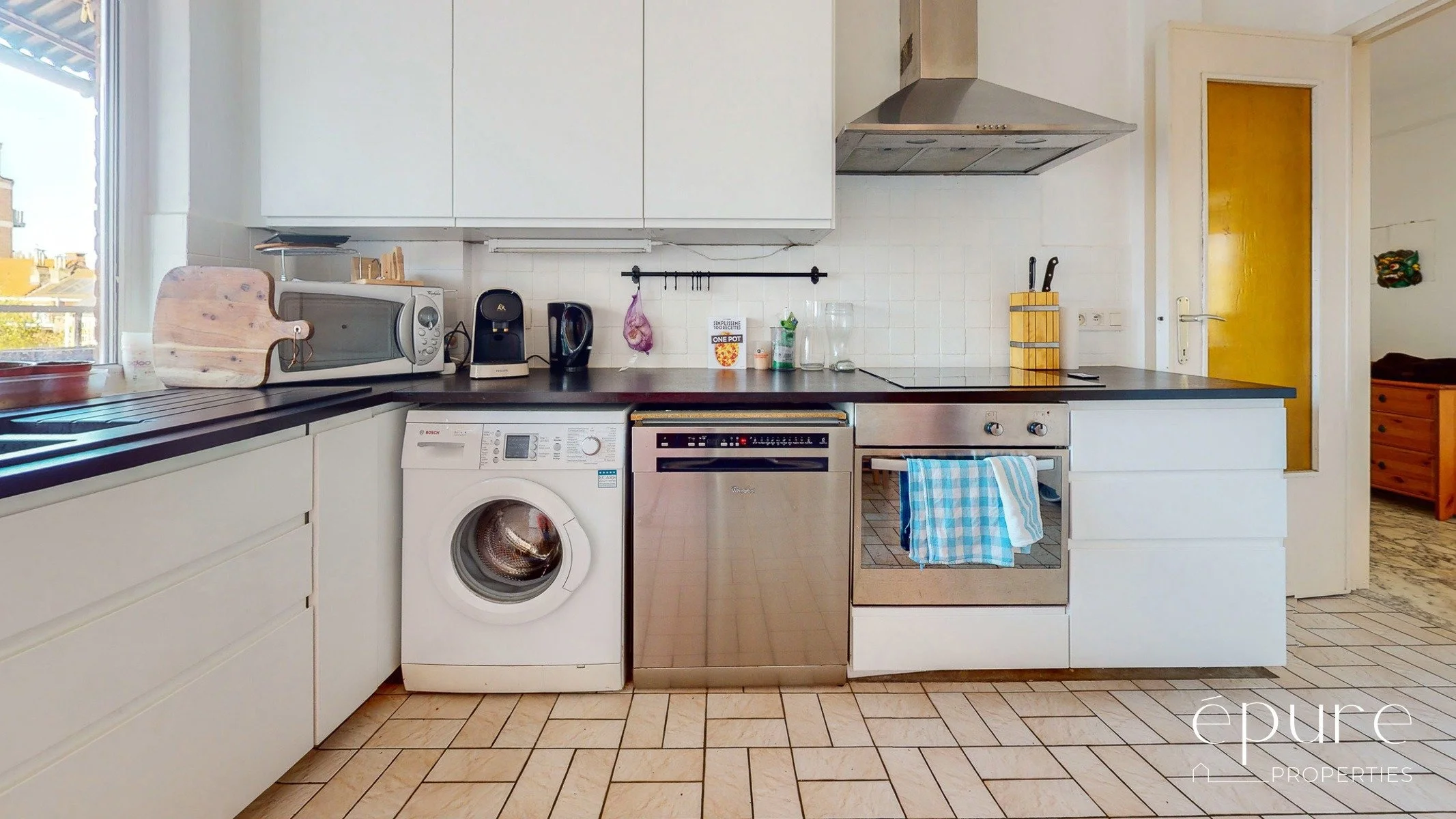 A l’arrière, la cuisine équipée de 12m2 avec coin déjeuner s’ouvre sur la terrasse arrière. Une arrière-cuisine de 4m2 offre un espace de rangement additionnel. Frigo et lave-vaisselle disponibles dans l’appartement.