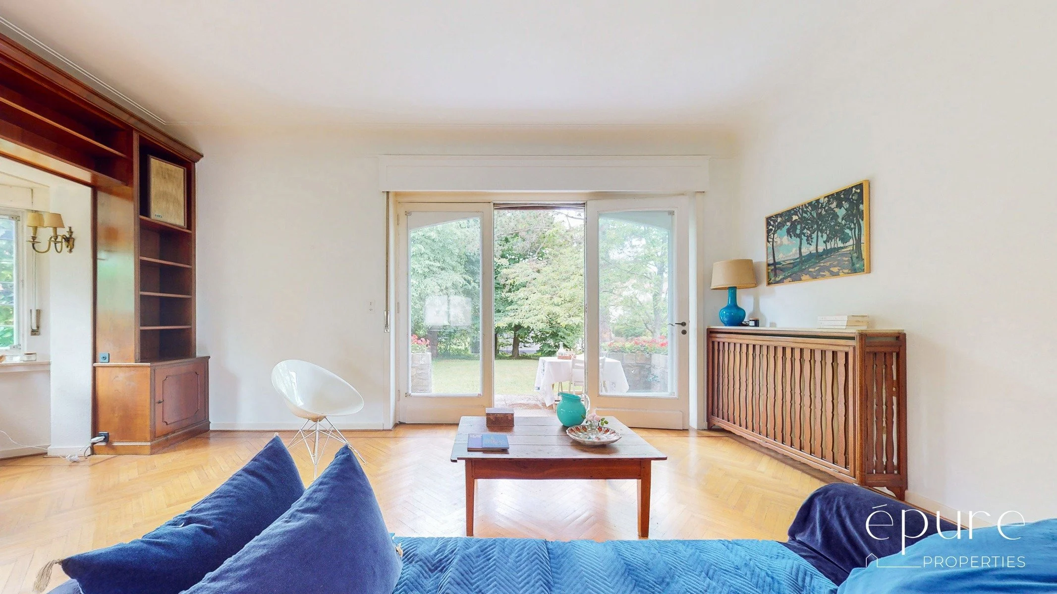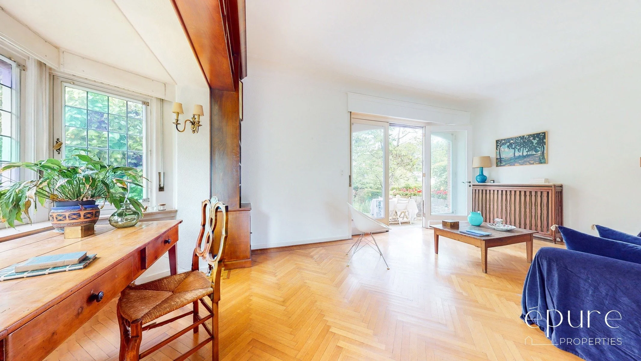 Le magnifique séjour en L de 65m2 se compose de la salle à manger, du salon et d’un espace bureau muni d’une grande bibliothèque. Il bénéficie d’une triple exposition et d’un ensoleillement tout au long de la journée. Cheminée fonctionnelle, parquet massif en arrête de poisson. Accès depuis le séjour vers la terrasse et le magnifique jardin arboré.