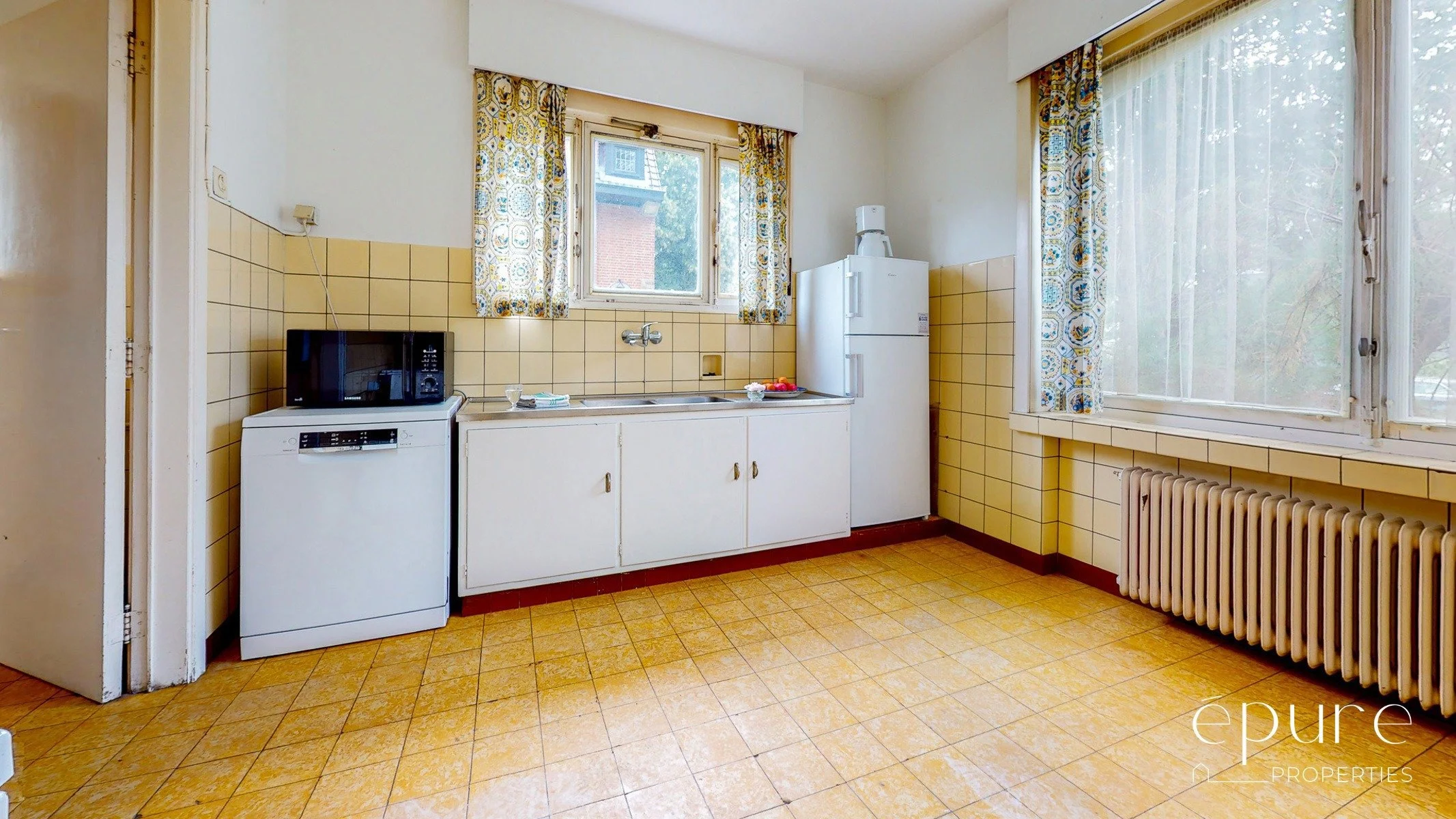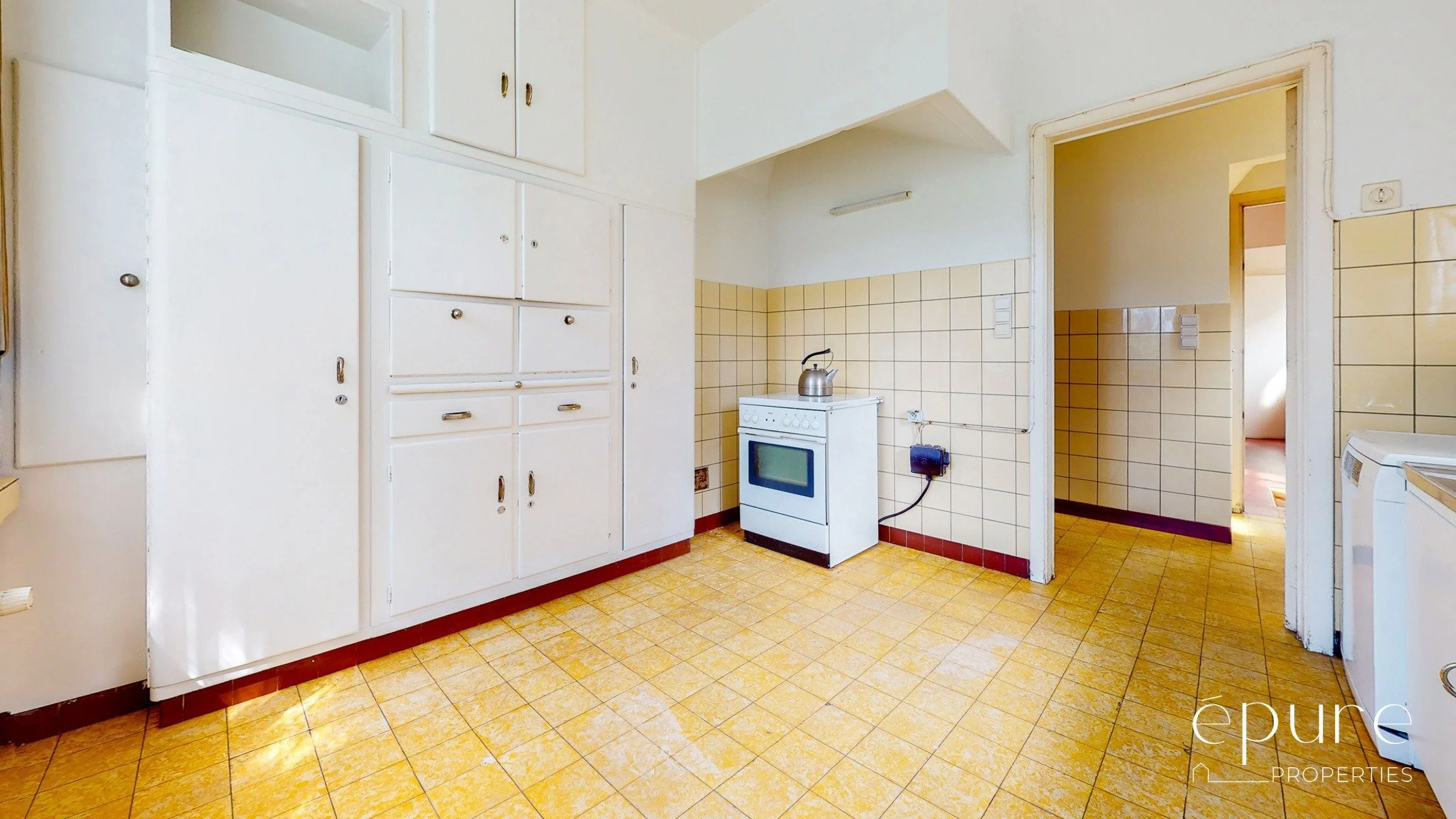 La cuisine (11 m2) et l’office attenant menant à la salle à manger pourraient être ouverts sur le séjour créant ainsi un espace de vie communiquant et ouvert de près de 80m2. Magnifiques armoires Cubex d’origine.